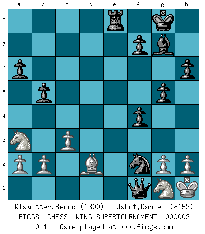 Last move : 0-1 2018 June 1 21:48:34 [Event "FICGS__CHESS__KING_SUPERTOURNAMENT__000002"] [Site "FICGS"] [Date "2018.05.01"] [Round "1"] [White "Klawitter,Bernd"] [Black "Jabot,Daniel"] [Result "0-1"] [WhiteElo "1300"] [BlackElo "2152"] 1.e4 e5 2.f4 exf4 3.Nf3 g5 4.Bc4 Bg7 5.d3 h6 6.c3 d6 7.Qb3 Qe7 8.O-O Nf6 9.Kh1 O-O 10.Na3 a6 11.Qc2 b5 12.Bb3 Nbd7 13.Qf2 Re8 14.Bc2 c5 15.Nb1 d5 16.Bd2 dxe4 17.dxe4 Bb7 18.Na3 Nxe4 19.Bxe4 Qxe4 20.Rae1 Qf5 21.Rxe8+ Rxe8 22.Ng1 Ne5 23.Qxc5 Qd3 24.Qf2 Ng4 25.Qf3 Bxf3 26.Nxf3 Qxf1+ 27.Ng1 Nf2+ 0-1 King's knight's gambit Kingside Castling by player White (move 8) Kingside Castling by player Black (move 9) Player Black won this chess game. Follow this game move after move (download)A Chess game is divided into three stages: the first, when you hope you have the advantage, the second when you believe you have an advantage, and the third... when you know you're going to lose ! (Savielly Tartakower) In der Schule lernt man nichts. Es ist nur Zeitverschwendung. (Robert James Fischer) Vive, pierde y aprende al observar a tu oponente como ganar. (Amber Steenbock) Pour se monter efficace, un Cavalier a besoin d'avant-postes ! Les Cavaliers font les meilleurs bloqueurs de pions passés. Gambling is the son of avarice and the father of despair. (French proverb)