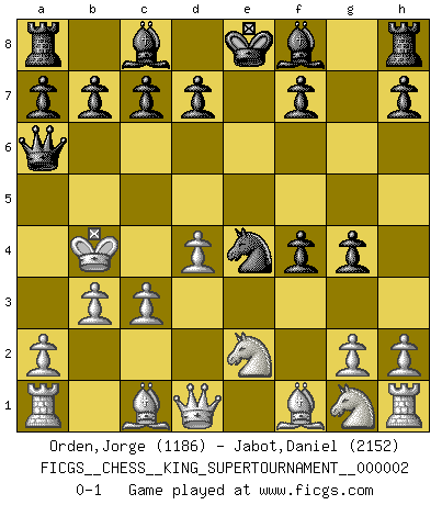 Last move : 0-1 2018 May 21 18:25:8 [Event "FICGS__CHESS__KING_SUPERTOURNAMENT__000002"] [Site "FICGS"] [Date "2018.05.01"] [Round "1"] [White "Orden,Jorge"] [Black "Jabot,Daniel"] [Result "0-1"] [WhiteElo "1186"] [BlackElo "2152"] 1.e4 e5 2.f4 exf4 3.Nf3 g5 4.b3 Bg7 5.Nc3 g4 6.Ng1 Qh4+ 7.Ke2 Nc6 8.Kd3 Nf6 9.Nce2 Nb4+ 10.Kc4 Nxe4 11.c3 Qf6 12.d4 Qa6+ 13.Kxb4 Bf8+ 0-1 King's knight's gambit Player Black won this chess game. Follow this game move after move (download)It began to feel as though you were playing against Chess itself. - On playing against Robert Fischer. (Walter Shipman) Ein typischer, sehr verbreiteter Gedankenschädling ist der, daß der betreffende Amateur von der Annanhme ausgeht, daß jeder einzelne Zug etwas zu leisten habe. (Aaron Nimzowitsch) Solo el jugador con la iniciativa tiene el derecho a atacar. (Wilhelm Steinitz) La solitude du joueur d'Echecs à l'approche du mat est semblable à celle du condamné. (Francis Szpiner) The right perception of any matter and a misunderstanding of the same matter do not wholly exclude each other. (Kafka's the trial)