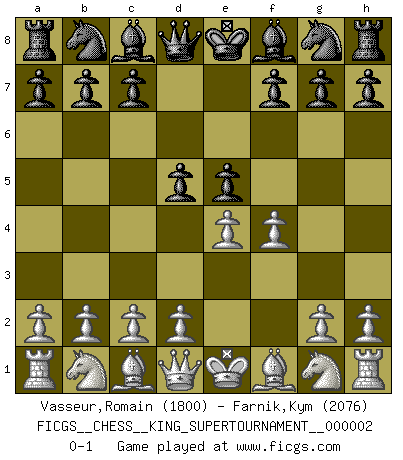 Last move : 0-1 2018 June 1 0:38:7 [Event "FICGS__CHESS__KING_SUPERTOURNAMENT__000002"] [Site "FICGS"] [Date "2018.05.01"] [Round "1"] [White "Vasseur,Romain"] [Black "Farnik,Kym"] [Result "0-1"] [WhiteElo "1800"] [BlackElo "2076"] 1.e4 e5 2.f4 d5 0-1 This chess game has been lost on time (started : 2018.05.01 22:10:15) KGD : Falkbeer counter-gambit Player Black won this chess game. Follow this game move after move (download)What would Chess be without silly mistakes ? (Kurt Richter) Es hat in meinem Leben Zeiten gegeben, da ich sehr nahe daran war zu glauben, daß ich auch nicht eine einzige Schachpartie verlieren könnte. (José Raúl Capablanca) Existen dos clases de sacrificios: los correctos y los míos. (Mikhail Tal) Le joueur d'Echecs qui veut atteindre le top est obligé de développer son propre credo créatif. Alexeï Stepanovicth Souétine. Il est facile d'écrire des livres ! Ce qui est difficile, c'est de jouer ! (Alexeï Stepanovicth Souétine) Knowledge will give you power, but character respect. (Bruce Lee)