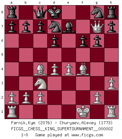 Last move : 1-0 2018 May 11 8:3:16 [Event "FICGS__CHESS__KING_SUPERTOURNAMENT__000002"] [Site "FICGS"] [Date "2018.05.01"] [Round "1"] [White "Farnik,Kym"] [Black "Churyaev,Alexey"] [Result "1-0"] [WhiteElo "2076"] [BlackElo "1773"] 1.e4 e5 2.f4 exf4 3.Nf3 Be7 4.Bc4 Bh4+ 5.Kf1 d6 6.d4 Be7 7.Nc3 Bg4 8.Bxf4 Nd7 9.h3 Bxf3 10.Qxf3 f6 11.Qh5+ g6 12.Qd5 Qc8 13.Qf7+ Kd8 14.Qg7 1-0 KGA : Cunningham defense Player White won this chess game. Follow this game move after move (download)Combinations have always been the most intriguing aspect of Chess. The masters look for them, the public applauds them, the critics praise them. It is because combinations are possible that Chess is more than a lifeless mathematical exercise. They are the poetry of the game; they are to Chess what melody is to music. They represent the triumph of mind over matter. (Reuben Fine) Schach ist wie eine schöne Frau, zu der wir ständig zurückkehren, gleichviel, wie oft sie uns zurückweist. (Anonymous) La única cosa que los jugadores de Ajedrez tienen en común, es el Ajedrez. (Lodewijk Prins) Les Echecs mettent en conflit, non pas deux intelligences, mais deux volontés. (Lasker) To err is human, to shift the blame on someone else is tactical. (Mladen Jankovic)
