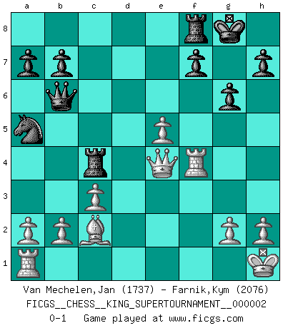 Last move : 0-1 2018 May 14 11:45:36 [Event "FICGS__CHESS__KING_SUPERTOURNAMENT__000002"] [Site "FICGS"] [Date "2018.05.01"] [Round "1"] [White "Van Mechelen,Jan"] [Black "Farnik,Kym"] [Result "0-1"] [WhiteElo "1737"] [BlackElo "2076"] 1.e4 e5 2.f4 d5 3.exd5 c6 4.Nc3 exf4 5.Nf3 Bd6 6.d4 Ne7 7.dxc6 Nbxc6 8.Bc4 O-O 9.O-O Bg4 10.Ne4 Bc7 11.c3 Rc8 12.Bb3 Na5 13.Bc2 Nd5 14.Qd3 g6 15.Ne5 Bf5 16.Bxf4 Nxf4 17.Rxf4 Bxe5 18.dxe5 Qb6+ 19.Kh1 Bxe4 20.Qxe4 Rc4 0-1 Kym Farnik Thanks for the game KGD : Nimzovich counter-gambit Kingside Castling by player Black (move 8) Kingside Castling by player White (move 9) Player Black won this chess game. Follow this game move after move (download)White lost because he failed to remember the right continuation and had to think up the moves himself. (Siegbert Tarrasch) Wer der Ansicht ist, daß alle Schachspieler verrückt sind, wird durch Studium des Lebens von Emil Josef Diemer nicht auf andere Gedanken kommen. (Hans Ree) Buenas posiciones no logran ganar juegos, buenas movidas sí. (Gerald Abrahams) Echiquier : carré parfait, comme la Jérusalem nouvelle décrite par l'auteur de l'Apocalypse, huit cases sur huit, exaltation du chiffre 4, symbole du cosmos aux quatre horizons... où le noir et le blanc, l'ombre et la lumière, le mal et le bien s'entremêlent et se conjuguent. (Robert Couffignal, Le Gambit du poète) Question: Is 'This statement is paradoxical' a paradoxical statement ? Or is it a meta-paradox ? (Normajean Yates)