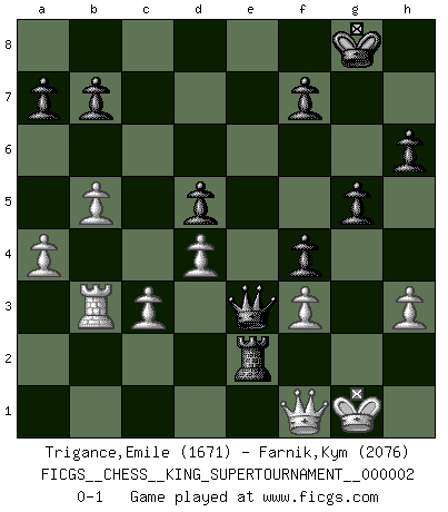 Last move : 0-1 2018 July 8 7:26:16 [Event "FICGS__CHESS__KING_SUPERTOURNAMENT__000002"] [Site "FICGS"] [Date "2018.05.01"] [Round "1"] [White "Trigance,Emile"] [Black "Farnik,Kym"] [Result "0-1"] [WhiteElo "1671"] [BlackElo "2076"] 1.e4 e5 2.f4 d5 3.exd5 c6 4.Nc3 exf4 5.Nf3 Bd6 6.d4 Ne7 7.Bd3 cxd5 8.O-O Nbc6 9.Nb5 h6 10.Nxd6+ Qxd6 11.c3 g5 12.Qc2 Bg4 13.h3 Bh5 14.b4 Rc8 15.Qb1 O-O 16.a4 Ng6 17.Ba3 Nce7 18.b5 Qc7 19.Bxe7 Nxe7 20.Ra3 Ng6 21.Bf5 Bxf3 22.Rxf3 Nh4 23.Bxc8 Nxf3+ 24.gxf3 Qxc8 25.Kg2 Re8 26.Qd1 Qc4 27.Qf1 Re2+ 28.Kg1 Qd3 29.Rb3 Qe3+ 0-1 KGD : Nimzovich counter-gambit Kingside Castling by player White (move 8) Kingside Castling by player Black (move 15) Player Black won this chess game. Follow this game move after move (download)I'm not afraid of Spassky. The world knows I'm the best. You don't need a match to prove it. (Bobby Fischer) Ohne Fehler kann es keine Brillanz geben. (Emanuel Lasker) Aunque la mayoría de la gente disfruta observar las partidas de los grandes Maestros de ataque, algunos de los jugadores mas notables en la historia han sido los jugadores silenciosos posicionales. Lentamente ellos te aplastan despojandote de tu espacio, congestionando tus piezas y dejandote virtualmente sin nada que hacer. (Yasser Seirawan) Les réformistes prétendent que les progrès de la théorie conduiront à la disparition des échecs, et qu'il faut, pour leur rendre vie, en remanier les règles. En réalité, qu'exprime cette affirmation? Le mépris de l'intuition, de l'imagination et de tous les autres éléments qui font des échecs un art. (Alexander Alekhine) Train yourself to let go of everything you fear to lose. (Master Yoda in Star Wars ep.3)