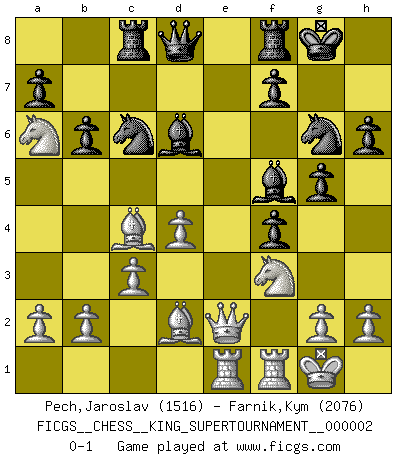Last move : 0-1 2018 June 18 15:12:14 [Event "FICGS__CHESS__KING_SUPERTOURNAMENT__000002"] [Site "FICGS"] [Date "2018.05.01"] [Round "1"] [White "Pech,Jaroslav"] [Black "Farnik,Kym"] [Result "0-1"] [WhiteElo "1516"] [BlackElo "2076"] 1.e4 e5 2.f4 d5 3.exd5 c6 4.Nc3 exf4 5.Nf3 Bd6 6.Bc4 Ne7 7.dxc6 Nbxc6 8.d4 O-O 9.O-O Bg4 10.Ne4 Bc7 11.c3 h6 12.Nc5 b6 13.Na6 Bd6 14.Qd3 Rc8 15.Bd2 g5 16.Rae1 Bf5 17.Qe2 Ng6 0-1 This chess game has been lost on time (started : 2018.05.01 22:10:15) KGD : Nimzovich counter-gambit Kingside Castling by player Black (move 8) Kingside Castling by player White (move 9) Player Black won this chess game. Follow this game move after move (download)Chess is like life. (Boris Spassky) Ja, ich habe einmal eine Blitzpartie gespielt, es war in einem Zug, 1929. --im Interview 1989 (Mikhail Moiseyevich Botvinik) El Ajedrez te enseña a controlarl la excitación inicial que sientes cuando vez algo que parece bueno y te enseña a pensar objetivamente cuando te encuentras en problemas. (Stanley Kubrick) J'ai toujours senti une vague pitié pour l'homme qui ne connaît rien aux échecs, tout comme j'en aurais pour un homme ignorant de l'amour. Les Echecs, comme la musique ou comme l'amour, ont le pouvoir de rendre heureux. (Siegbert Tarrasch) Memory is a crazy woman that hoards colored rags and throws away food. (Austin O'Malley)