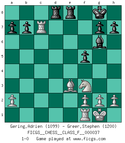 Last move : 1-0 2007 July 29 13:18:2 [Event "FICGS__CHESS__CLASS_F__000037"] [Site "FICGS"] [Date "2007.05.03"] [Round "1"] [White "Gering,Adrien"] [Black "Greer,Stephen"] [Result "1-0"] [WhiteElo "1099"] [BlackElo "1200"] 1.e4 e5 2.Nf3 Nc6 3.Bc4 Bc5 4.c3 Nf6 5.d4 exd4 6.cxd4 Bb4+ 7.Nc3 Nxe4 8.Qe2 d5 9.Bd3 O-O 10.Bxe4 dxe4 11.Ne5 Nxd4 12.Qxe4 Bxc3+ 13.bxc3 Bf5 14.Qxd4 Qxd4 15.cxd4 Rfe8 16.O-O c5 17.Nf3 cxd4 18.Nxd4 Bg6 19.Be3 Rad8 20.Rad1 Rc8 21.Rc1 Rcd8 22.Rc7 f5 23.Nf3 1-0 Giuoco Piano : Greco's attack Kingside Castling by player Black (move 9) Kingside Castling by player White (move 16) Player White won this chess game. Follow this game move after move (download)There are tough players and nice guys, and I'm a tough player. (Bobby Fischer) Spiel ein langweiliges Spiel zu Ende und lustige Dinge können passieren. (Hans Ree) El Ajedrez, como cualquier actividad creativa, solo puede existir a través del esfuerzo combinado de aquellos que tienen talento creativo y de aquellos que poseen la habilidad de organizar su trabajo creativo. (Mikhail Botvinnik) J'ai toujours senti une vague pitié pour l'homme qui ne connaît rien aux échecs, tout comme j'en aurais pour un homme ignorant de l'amour. Les Echecs, comme la musique ou comme l'amour, ont le pouvoir de rendre heureux. (Siegbert Tarrasch) Memory... is the diary that we all carry with us. (Oscar Wilde, The Importance of Being Earnest)
