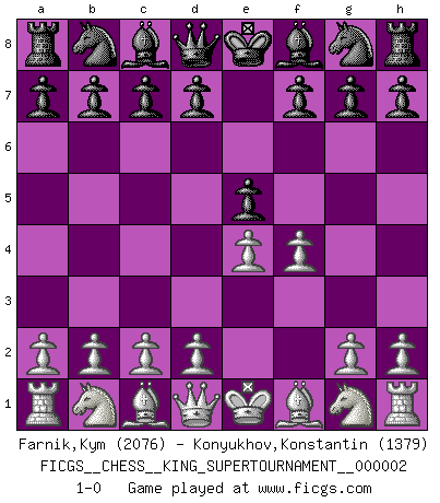 Last move : 1-0 2018 June 1 0:38:7 [Event "FICGS__CHESS__KING_SUPERTOURNAMENT__000002"] [Site "FICGS"] [Date "2018.05.01"] [Round "1"] [White "Farnik,Kym"] [Black "Konyukhov,Konstantin"] [Result "1-0"] [WhiteElo "2076"] [BlackElo "1379"] 1.e4 e5 2.f4 1-0 This chess game has been lost on time (started : 2018.05.01 22:10:15) King's gambit Player White won this chess game. Follow this game move after move (download)Tactics flow from a superior position. (Bobby Fischer) Im Spitzenschach von heute geht es nur um Vorbereitung, um tiefgründige, sorgfältige Eröffnungsvorbereitung. (Nigel Short) El Ajedrez tiene tanto misterio como las mujeres. (Purdy) Karpov est une pièce de musée. (Garry Kasparov) Luck is when opportunity knocks and you answer. (Anonymous)