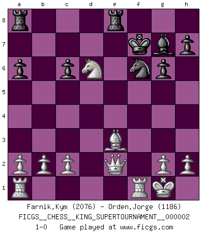 Last move : 1-0 2018 May 25 23:20:29 [Event "FICGS__CHESS__KING_SUPERTOURNAMENT__000002"] [Site "FICGS"] [Date "2018.05.01"] [Round "1"] [White "Farnik,Kym"] [Black "Orden,Jorge"] [Result "1-0"] [WhiteElo "2076"] [BlackElo "1186"] 1.e4 e5 2.f4 Nc6 3.Nf3 d6 4.Nc3 Bg4 5.Bb5 Bxf3 6.Qxf3 a6 7.Bxc6+ bxc6 8.O-O g6 9.fxe5 Qd7 10.exd6 cxd6 11.d4 Bg7 12.e5 dxe5 13.dxe5 f5 14.exf6 Nxf6 15.Qe2+ Kf7 16.Bg5 Qd4+ 17.Be3 Qd6 18.Ne4 Rhe8 19.Nxd6+ 1-0 King's gambit Kingside Castling by player White (move 8) Player White won this chess game. Follow this game move after move (download)The stomach is an essential part of the Chess master. (Bent Larsen) Im Wettkampf zwischen starken Meistern kommen Fehler sehr selten vor, deshalb ist es mit bloßem Warten nicht getan. (José Raúl Capablanca) La táctica fluye a partir de una posición superior. (Bobby Fischer) Demandez au pauvre Cg1 ce qu'il en pense. Eduard Gufeld à propos de la variante Saemisch de l'Est-Indienne. Life is like a game of cards: the hand you are dealt represents determinism; the way you play it is free will. (Jawaharlal Nehru)