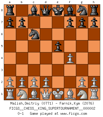 Last move : 0-1 2018 June 3 12:52:57 [Event "FICGS__CHESS__KING_SUPERTOURNAMENT__000002"] [Site "FICGS"] [Date "2018.05.01"] [Round "1"] [White "Malish,Dmitriy"] [Black "Farnik,Kym"] [Result "0-1"] [WhiteElo "0771"] [BlackElo "2076"] 1.e4 e5 2.f4 d5 3.exd5 c6 4.dxc6 Nxc6 0-1 This chess game has been lost on time (started : 2018.05.01 22:10:15) KGD : Nimzovich counter-gambit Player Black won this chess game. Follow this game move after move (download)The enormous mental resilience, without which no Chess player can exist, was so much taken up by Chess that he could never free his mind of this game. (Albert Einstein) Ich verlor meine Bürgerrechte, mein Gehalt wurde mir nicht mehr bezahlt und ich wurde zensiert und durfte nicht mehr ins Ausland reisen. [nach dem Match Fischer-Taimanov 6:0] (Mark Taimanov) Cualquier cambio de material en una posición debe venir por medio de un mate, una captura o promoción de Peón. (Purdy) Lorsque vous vous retrouvez devant une position atroce, ne tendez pas un ultime piège dérisoire avec l'intention d'abandonner si l'adversaire le déjoue ! Faites-vous plutôt un devoir de résister comme si votre vie en dépendait. Jouez le coup qui vous déplairait au centuple si vous étiez dans la peau de votre tortionnaire ! Perfection is achieved, not when there is nothing more to add, but when there is nothing left to take away. (Antoine de Saint-Exupéry)
