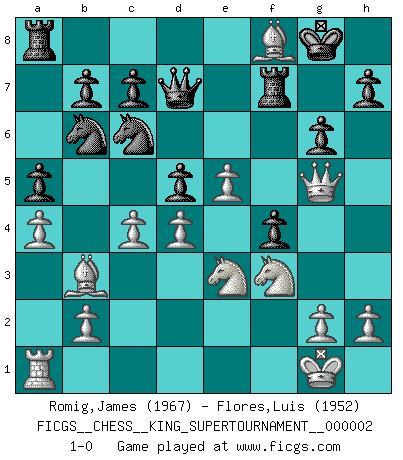 Last move : 1-0 2018 May 18 12:8:47 [Event "FICGS__CHESS__KING_SUPERTOURNAMENT__000002"] [Site "FICGS"] [Date "2018.05.01"] [Round "1"] [White "Romig,James"] [Black "Flores,Luis"] [Result "1-0"] [WhiteElo "1967"] [BlackElo "1952"] 1.e4 e5 2.f4 Nc6 3.Nf3 exf4 4.d4 Nf6 5.e5 Nd5 6.Bc4 Nb6 7.Bb3 d5 8.Bxf4 Be7 9.c3 O-O 10.O-O Bf5 11.Nbd2 Qd7 12.a4 a5 13.Qe1 Bd3 14.Qg3 Bxf1 15.Bh6 g6 16.Nxf1 f5 17.Ne3 Rf7 18.c4 Bf8 19.Bxf8 f4 20.Qg5 1-0 King's gambit Kingside Castling by player Black (move 9) Kingside Castling by player White (move 10) Player White won this chess game. Follow this game move after move (download)It is the aim of the modern school, not to treat every position according to one general law, but according to the principle inherent in the position. (Richard Reti) Alles was ich jemals tun will ist Schach spielen. (Robert James Fischer) Por la belleza de sus partidas, la claridad de su juego y lo brillante de sus ideas, Fischer se creó el mismo como un artista de la misma estatura como Brahms, Rembrandt y Shakespeare. (David Levy) L'ordinateur a tué l'originalité. Il n'y a plus guère d'aventures sur l'échiquier. (Jacob Murray) The quality of decision is like the well-timed swoop of a falcon which enables it to strike and destroy its victim. (Sun Tzu)
