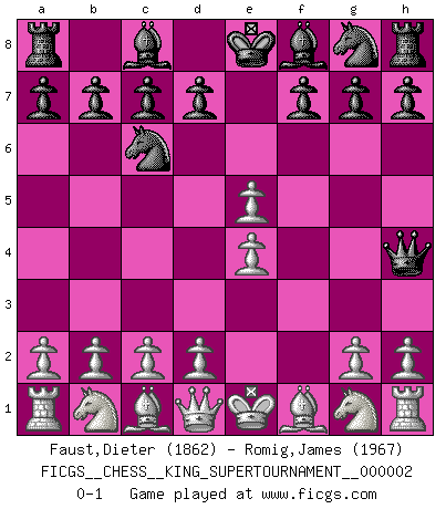 Last move : 0-1 2018 May 21 16:34:43 [Event "FICGS__CHESS__KING_SUPERTOURNAMENT__000002"] [Site "FICGS"] [Date "2018.05.01"] [Round "1"] [White "Faust,Dieter"] [Black "Romig,James"] [Result "0-1"] [WhiteElo "1862"] [BlackElo "1967"] 1.e4 e5 2.f4 Nc6 3.fxe5 Qh4+ 0-1 King's gambit Player Black won this chess game. Follow this game move after move (download)Any material change in a position must come about by mate, a capture, or a Pawn promotion. (Purdy) Es hat in meinem Leben Zeiten gegeben, da ich sehr nahe daran war zu glauben, daß ich auch nicht eine einzige Schachpartie verlieren könnte. (José Raúl Capablanca) Yo adoro todas la posiciones. Denme una partida posicional difícil, y la jugaré. Pero posiciones totalmente ganadas, no las tolero. (Hein Donner) Il vaut toujours mieux jouer un plan faux de façon logique que de n'avoir pas de plan du tout. (Victor Kortchnoï) There are two major products that came out of Berkeley: LSD and UNIX. We do not believe this is to be a coincidence. (Jeremy S. Anderson)