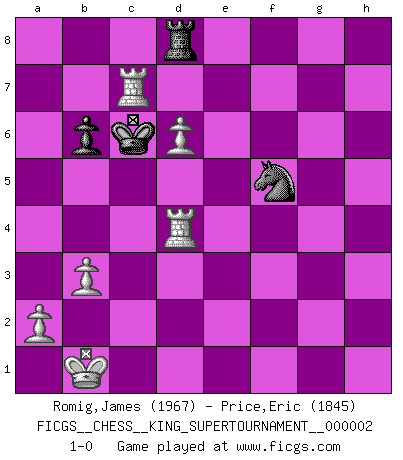 Last move : 1-0 2018 May 15 9:7:5 [Event "FICGS__CHESS__KING_SUPERTOURNAMENT__000002"] [Site "FICGS"] [Date "2018.05.01"] [Round "1"] [White "Romig,James"] [Black "Price,Eric"] [Result "1-0"] [WhiteElo "1967"] [BlackElo "1845"] 1.e4 e5 2.f4 exf4 3.Nf3 g5 4.Nc3 Nc6 5.h3 Bg7 6.d4 d6 7.g3 g4 8.hxg4 Bxg4 9.Bxf4 Nxd4 10.Bg2 Qd7 11.Qd3 Nxf3+ 12.Bxf3 O-O-O 13.O-O-O Nf6 14.Bh6 Bxh6+ 15.Rxh6 Bxf3 16.Qxf3 Ng4 17.Rh4 Ne5 18.Qf2 b6 19.Nd5 Kb7 20.Nf6 Qe6 21.b3 a5 22.Kb1 a4 23.Qf4 h6 24.Qf5 axb3 25.cxb3 Ra8 26.Rdh1 Ra3 27.Qxe6 fxe6 28.Rxh6 Rha8 29.R1h2 Rf8 30.Rd2 Rf7 31.g4 Rxf6 32.Rxf6 Nxg4 33.Rxe6 Ra5 34.Rd5 Ra8 35.Re7 Rd8 36.e5 Kc6 37.Rd4 Ne3 38.exd6 Nf5 39.Rxc7+ 1-0 KGA : Quaade gambit Queenside Castling by player Black (move 12) Queenside Castling by player White (move 13) 10 pieces endgame at move 39 : White KRRPPP , Black KRNP WHITE : King + 2 Rooks 3 Pawns BLACK : King + 1 Rook 1 Knight 1 Pawn Player White won this chess game. Follow this game move after move (download)Fischer is the strongest player in the world. In fact, the strongest player who ever lived. (Larry Evans) Wenn sie aufgeben, dann danke ich Ihnen für das Spiel (Eventualzug beim Fernschach). (Anonymous) Aquel que teme a un Peón de Reina aislado, debería de retirarse del Ajedrez. (Siegbert Tarrasch) 'L'échange des dames est un coup dur pour les deux adversaires...' Un journaliste lors d'une partie du match Spassky-Fischer I fear not the man who has practiced 10,000 kicks once, but I fear the man who has practiced one kick 10,000 times. (Bruce Lee)