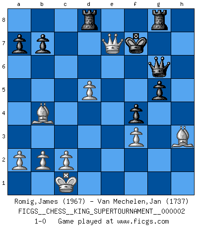 Last move : 1-0 2018 May 27 12:52:5 [Event "FICGS__CHESS__KING_SUPERTOURNAMENT__000002"] [Site "FICGS"] [Date "2018.05.01"] [Round "1"] [White "Romig,James"] [Black "Van Mechelen,Jan"] [Result "1-0"] [WhiteElo "1967"] [BlackElo "1737"] 1.e4 e5 2.f4 exf4 3.Nf3 g5 4.h3 Bg7 5.d4 Nc6 6.d5 Ne5 7.h4 h6 8.d6 cxd6 9.Nc3 Nxf3+ 10.gxf3 Ne7 11.Qxd6 Nc6 12.Bd2 Be5 13.Qd3 d6 14.O-O-O Be6 15.Nd5 Rg8 16.hxg5 hxg5 17.Qa3 Bxd5 18.exd5 Ne7 19.Re1 Ng6 20.Rh6 Qe7 21.Bc3 f6 22.Bh3 Qg7 23.Rxg6 Qxg6 24.Qxd6 Rd8 25.Rxe5+ fxe5 26.Qxe5+ Kf8 27.Bb4+ Kf7 28.Qe7+ 1-0 King's knight's gambit Queenside Castling by player White (move 14) Player White won this chess game. Follow this game move after move (download)Do you realize Fischer almost never has any bad pieces? He exchanges them, and the bad pieces remain with his opponents. (Yuri Balashov) Ich bin der einzige Schachspieler, der sich während der Vorbereitungen zum Turnier verletzt hat. (Woody Allen) Cuando veas una buena jugada, trata de encontrar otra mejor. (Emanuel Lasker) Le succès, c'est être capable d'aller d'échec en échec sans perdre son enthousiasme. (Winston Churchill) All art requires courage. (Anne Tucker)