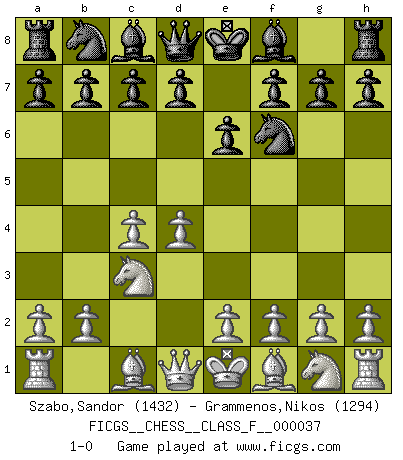 Last move : 1-0 2007 June 14 13:32:0 [Event "FICGS__CHESS__CLASS_F__000037"] [Site "FICGS"] [Date "2007.05.03"] [Round "1"] [White "Szabo,Sandor"] [Black "Grammenos,Nikos"] [Result "1-0"] [WhiteElo "1432"] [BlackElo "1294"] 1.d4 Nf6 2.c4 e6 3.Nc3 1-0 This chess game has been lost on time (started : 2007.05.03 12:34:46) Queen's pawn game Player White won this chess game. Follow this game move after move (download)It is no time to be playing Chess when the house is on fire. (Italian Proverb) Karpov ist ein Museumsstück. (Garry Kasparov) Tu cuerpo tiene que estar en óptima condición. Tu Ajedrez se deteriora como lo hace tu cuerpo. No puedes separar la mente y el cuerpo. (Bobby Fischer) Les sacrifices démontrent seulement que quelqu'un a gaffé. (Savielly Tartacover) Bobby never cared about money, though. His only desire was to prove that his choices were correct: He wanted chess to be important because he was a chess player, and he wanted to be important. Bobby knew money was important, but he didn't have a clue why, outside of clothes and status. The only way he could accomplish what he wanted was to fight for a lot of money. Once he got it, he gave it away. He did not know how to spend it. And once he'd become champion, after, essentially, sacrificing his life for it, he didn't know how to spend his time. (Bob Wade)