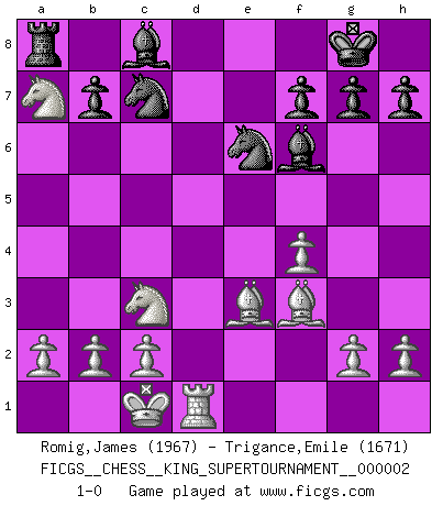 Last move : 1-0 2018 June 3 18:52:51 [Event "FICGS__CHESS__KING_SUPERTOURNAMENT__000002"] [Site "FICGS"] [Date "2018.05.01"] [Round "1"] [White "Romig,James"] [Black "Trigance,Emile"] [Result "1-0"] [WhiteElo "1967"] [BlackElo "1671"] 1.e4 e5 2.f4 d5 3.exd5 e4 4.d3 Nf6 5.dxe4 Nxe4 6.Nf3 Be7 7.Bd3 Qxd5 8.Qe2 Nc5 9.Bc4 Qe4 10.Nc3 Qxe2+ 11.Bxe2 O-O 12.Be3 Rd8 13.Nd4 c6 14.O-O-O Nba6 15.Rhe1 Nc7 16.Bf3 Bf6 17.Nxc6 Rxd1+ 18.Rxd1 N5e6 19.Nxa7 1-0 KGD : Falkbeer, 5.de Kingside Castling by player Black (move 11) Queenside Castling by player White (move 14) Player White won this chess game. Follow this game move after move (download)A passed Pawn increases in strength as the number of pieces on the board diminishes. (Capablanca) Dass jemand wie Surab Asmaiparaschwili, der selbst Elopunkte gekauft hat , Vize-Präsident der Fide werden konnte, sagt schon einges über den Zustand dieser Organisation aus. (Joel Lautier) Vive, pierde y aprende al observar a tu oponente como gana. (Amber Steenbock) Aucun coup ne doit être joué sans but. (Pedro Damiano) A good aphorism is too hard for the tooth of time, and is not worn away with the centuries, although it serves as food for every speech. (Friedrich Nietzsche)