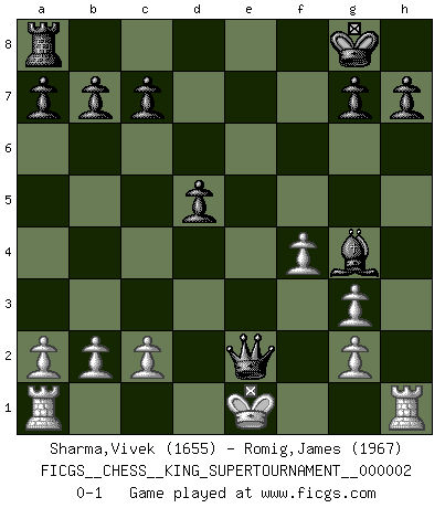 Last move : 0-1 2018 May 9 10:55:30 [Event "FICGS__CHESS__KING_SUPERTOURNAMENT__000002"] [Site "FICGS"] [Date "2018.05.01"] [Round "1"] [White "Sharma,Vivek"] [Black "Romig,James"] [Result "0-1"] [WhiteElo "1655"] [BlackElo "1967"] 1.e4 e5 2.f4 Nc6 3.d3 d5 4.d4 exd4 5.e5 Bc5 6.Nf3 Nh6 7.Nbd2 O-O 8.Nb3 Bb6 9.Nbxd4 Nxd4 10.Nxd4 f6 11.exf6 Qxf6 12.Be3 Re8 13.Kf2 Rxe3 14.Kxe3 Bxd4+ 15.Qxd4 Nf5+ 16.Kd3 Qxd4+ 17.Ke2 Ng3+ 18.hxg3 Bg4+ 19.Ke1 Qe3+ 20.Be2 Qxe2+ 0-1 King's gambit Kingside Castling by player Black (move 7) Player Black won this chess game. Follow this game move after move (download)When asked, -How is that you pick better moves than your opponents?, I responded: I'm very glad you asked me that, because, as it happens, there is a very simple answer. I think up my own moves, and I make my opponent think up his. (Alexander Alekhine) Kasparov stellt für gewöhnlich die Regeln auf und bricht sie dann selbst wieder. (Alexej Shirov) Prefiero perder una partida realmente buena, que ganar una mala. (David Levy) Vous n'êtes pas toujours obligé de jouer le meilleur coup. Un coup doit être actif, entreprenant, correct et beau ! (David Bronstein) All war is based on deception. (Sun Tzu)