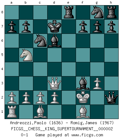 Last move : 0-1 2018 May 15 7:1:6 [Event "FICGS__CHESS__KING_SUPERTOURNAMENT__000002"] [Site "FICGS"] [Date "2018.05.01"] [Round "1"] [White "Andreozzi,Paolo"] [Black "Romig,James"] [Result "0-1"] [WhiteElo "1636"] [BlackElo "1967"] 1.e4 e5 2.f4 Nc6 3.fxe5 Qh4+ 4.g3 Qxe4+ 5.Qe2 Qxh1 6.Nf3 d6 7.exd6 Be7 8.Nc3 Bg4 9.Nd5 Bxf3 10.Nxc7+ Kd7 11.Qd3 Bxd6 12.Nb5 Re8+ 13.Kf2 Qxh2+ 0-1 King's gambit Player Black won this chess game. Follow this game move after move (download)The hardest game to win is a won game. (Emanuel Lasker) Ja, ich habe einmal eine Blitzpartie gespielt, es war in einem Zug, 1929. --im Interview 1989 (Mikhail Moiseyevich Botvinik) Dejen al perfeccionista jugar por correo. (Yasser Seirawan) Echiquier : carré parfait, comme la Jérusalem nouvelle décrite par l'auteur de l'Apocalypse, huit cases sur huit, exaltation du chiffre 4, symbole du cosmos aux quatre horizons... où le noir et le blanc, l'ombre et la lumière, le mal et le bien s'entremêlent et se conjuguent. (Robert Couffignal, Le Gambit du poète) He who laughs last probably does not get the joke. (Unknown)