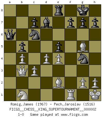 Last move : 1-0 2018 June 22 15:50:17 [Event "FICGS__CHESS__KING_SUPERTOURNAMENT__000002"] [Site "FICGS"] [Date "2018.05.01"] [Round "1"] [White "Romig,James"] [Black "Pech,Jaroslav"] [Result "1-0"] [WhiteElo "1967"] [BlackElo "1516"] 1.e4 e5 2.f4 Bc5 3.Nf3 d6 4.c3 Bg4 5.fxe5 dxe5 6.Qa4+ Bd7 7.Qc2 Nc6 8.b4 Bd6 9.d3 a6 10.Be2 b5 11.a4 Nf6 12.Bg5 O-O 13.O-O Be7 14.Kh1 Ng4 15.Bd2 Qb8 16.Qb2 Rd8 17.axb5 axb5 18.Rxa8 Qxa8 19.d4 Qa6 20.Ng5 Bxg5 21.Bxg5 Re8 22.Qb3 1-0 This chess game has been lost on time (started : 2018.05.01 22:10:15) KGD : Classical, Marshall attack Kingside Castling by player Black (move 12) Kingside Castling by player White (move 13) Player White won this chess game. Follow this game move after move (download)Fischer wanted to give the Russians a taste of their own medicine. (Larry Evans) Man braucht nicht immer den besten Zug zu spielen: Ein Zug muß aktiv, unternehmungslustig, korrekt und schön sein. (David Bronstein) En manos de Fischer's, una diminuta ventaja teórica es tan buena como tener una Reina de ventaja. (Isaac Kashdan) Pour se monter efficace, un Cavalier a besoin d'avant-postes ! Les Cavaliers font les meilleurs bloqueurs de pions passés. They say poker is a zero-sum game. It must be, because every time I play my sum ends up zero. (Max Shapiro)