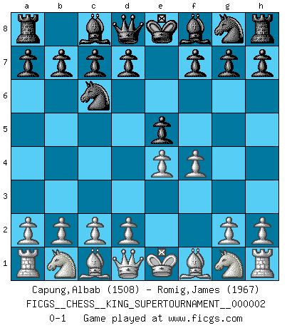 Last move : 0-1 2018 June 1 0:38:7 [Event "FICGS__CHESS__KING_SUPERTOURNAMENT__000002"] [Site "FICGS"] [Date "2018.05.01"] [Round "1"] [White "Capung,Albab"] [Black "Romig,James"] [Result "0-1"] [WhiteElo "1508"] [BlackElo "1967"] 1.e4 e5 2.f4 Nc6 0-1 This chess game has been lost on time (started : 2018.05.01 22:10:15) King's gambit Player Black won this chess game. Follow this game move after move (download)Botvinnik tried to take the mystery out of Chess, always relating it to situations in ordinary life. He used to call Chess a typical inexact problem similar to those which people are always having to solve in everyday life. (Garry Kasparov) Ich könnte leicht behaupten: Ja,ja, Leonid Breschnew wollte nicht, daß ich Weltmeister werde. In der Tat war die Sache komplizierter. (Viktor Kortschnoi) La pasion por jugar al Ajedrez es una de las mas inexplicables en el mundo. (H.G. Wells) La vie et les Echecs sont tous les deux une lutte constante. (Lasker) The Internet is so big, so powerful and pointless that for some people it is a complete substitute for life. (Andrew Brown)