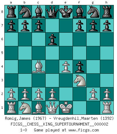Last move : 1-0 2018 June 3 0:45:49 [Event "FICGS__CHESS__KING_SUPERTOURNAMENT__000002"] [Site "FICGS"] [Date "2018.05.01"] [Round "1"] [White "Romig,James"] [Black "Vreugdenhil,Maarten"] [Result "1-0"] [WhiteElo "1967"] [BlackElo "1392"] 1.e4 e5 2.f4 exf4 3.Nf3 d6 4.Bc4 1-0 This chess game has been lost on time (started : 2018.05.01 22:10:15) KGA : Fischer defense Player White won this chess game. Follow this game move after move (download)It began to feel as though you were playing against Chess itself. - On playing against Robert Fischer. (Walter Shipman) Weshalb minderdergeübte Spieler mit g2-g4 beginnen? Die betreffenden sind unschlüssig, ob sie nun rechts (h4) oder links (f4) beginnen sollen, und in ihrer Ratlosigkeit entschliessen sie sich nach guter Bürgerart dazu, den goldenen Mittelweg zu wählen. (Aaron Nimzowitsch) Peones: ellos son el alma de esta partida, solos forman el ataque y la defensa. (Philidor) Le système Elo représente seulement une moyenne. Il est simplement un indicateur de votre stabilité. (Anatoli Karpov) I can't decide which is riskier; taking crazy risks, or taking advice on crazy risks from a crazy risk taker. (Gregory House in House M.D.)