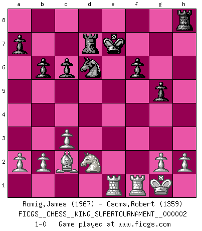 Last move : 1-0 2018 May 10 23:41:33 [Event "FICGS__CHESS__KING_SUPERTOURNAMENT__000002"] [Site "FICGS"] [Date "2018.05.01"] [Round "1"] [White "Romig,James"] [Black "Csoma,Robert"] [Result "1-0"] [WhiteElo "1967"] [BlackElo "1359"] 1.e4 e5 2.f4 Nf6 3.fxe5 Nxe4 4.Nf3 Bc5 5.d4 Bb6 6.Bd3 d5 7.exd6 Nxd6 8.Qe2+ Qe7 9.Qxe7+ Kxe7 10.Bf4 Re8 11.O-O Be6 12.Nbd2 Nc6 13.c3 Rad8 14.Bxh7 Rh8 15.Ng5 f6 16.Nxe6 Kxe6 17.Bc2 g5 18.Be3 Rd7 19.d5+ Ke7 20.Bxb6 cxb6 21.dxc6 bxc6 22.Rae1+ 1-0 KGD : 2...Nf6 Kingside Castling by player White (move 11) Player White won this chess game. Follow this game move after move (download)I believe that Chess possesses a magic that is also a help in advanced age. A rheumatic knee is forgotten during a game of Chess and other events can seem quite unimportant in comparison with a catastrophe on the chessboard. (Vlastimil Hort) Vielleicht wirkt die Aura früherer Spieler glanzvoller als die der heutigen Spieler, aber das liegt daran, dass man kein Programm wie Fritz hatte, das einem all die Löcher in ihren Partien zeigt. (Vladimir Kramnik) Debió haber existido una vez en que los hombres eran semidióses, de otra manera no hubiesen podido inventar el Ajedrez. (Gustav Schenk) Les échecs sont plus proches de l'art de l'assassinat que de l'art de la guerre. (Arturo Perez-Reverte) Watch your thoughts; they become words. Watch your words; they become actions. Watch your actions; they become habits. Watch your habits; they become character. Watch your character; it becomes your destiny. (Frank Outlaw)