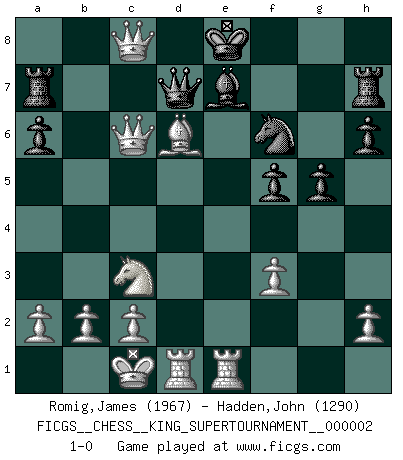 Last move : 1-0 2018 May 16 19:36:10 [Event "FICGS__CHESS__KING_SUPERTOURNAMENT__000002"] [Site "FICGS"] [Date "2018.05.01"] [Round "1"] [White "Romig,James"] [Black "Hadden,John"] [Result "1-0"] [WhiteElo "1967"] [BlackElo "1290"] 1.e4 e5 2.f4 d5 3.exd5 Qxd5 4.Nc3 Qd8 5.fxe5 Be6 6.d4 Be7 7.d5 Bf5 8.Bd3 Bxd3 9.Qxd3 f6 10.Qb5+ c6 11.Qxb7 Nd7 12.dxc6 Nxe5 13.c7 Qc8 14.Qd5 a6 15.Nf3 Nxf3+ 16.gxf3 f5 17.Qc4 Ra7 18.Bf4 Nf6 19.O-O-O h6 20.Rhe1 g5 21.Bd6 Rh7 22.Qc6+ Qd7 23.c8Q+ 1-0 KGD : Falkbeer counter-gambit Queenside Castling by player White (move 19) Promotion Queen by player White (move 23) Player White won this chess game. Follow this game move after move (download)The sign of a great Master is his ability to win a won game quickly and painlessly. (Irving Chernev) Ein guter Spieler hat immer Glück. (José Raúl Capablanca) Con el tiempo, empecé a progresar en partidas decisivas. Tal vez porque me di cuenta de una simple verdad: no solo estaba yo nervioso sino también mi oponente. (Mikhail Tal) À la honte des hommes, on sait que les lois du jeu sont les seules qui soient partout justes, claires, inviolables et exécutées. Pourquoi l'Indien qui a donné les règles du jeu d'échecs est-il obéi de bon gré dans toute la terre, et que les décrétales des papes, par exemple, sont aujourd'hui un objet d'horreur et de mépris ? C'est que l'inventeur des échecs combina tout avec justesse pour la satisfaction des joueurs, et que les papes, dans leurs décrétales, n'eurent en vue que leur seul avantage. L'Indien voulut exercer également l'esprit des hommes et leur donner du plaisir; les papes ont voulu abrutir l'esprit des hommes. Voltaire (Dictionnaire philosophique / Garnier 1967) My poor ole parrot... Is not in the circulation of displays ....poo hoo hoo :) (Wayne Lowrance's enigma)