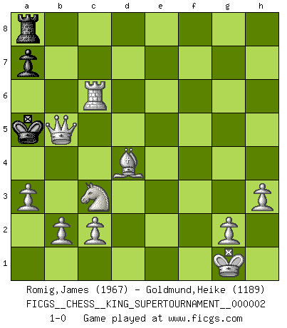 Last move : 1-0 2018 May 12 21:4:47 [Event "FICGS__CHESS__KING_SUPERTOURNAMENT__000002"] [Site "FICGS"] [Date "2018.05.01"] [Round "1"] [White "Romig,James"] [Black "Goldmund,Heike"] [Result "1-0"] [WhiteElo "1967"] [BlackElo "1189"] 1.e4 e5 2.f4 exf4 3.Nf3 Nc6 4.d4 d6 5.Bxf4 Nf6 6.Nc3 Bg4 7.Be2 Be7 8.O-O O-O 9.h3 Bd7 10.a3 Re8 11.Bd3 Nh5 12.Bh2 Bf6 13.e5 dxe5 14.dxe5 Nxe5 15.Nxe5 Bxe5 16.Bxh7+ Kxh7 17.Qxh5+ Kg8 18.Qxf7+ Kh8 19.Qh5+ Kg8 20.Bxe5 Qe7 21.Bd4 Bc6 22.Rf4 Rf8 23.Rh4 b6 24.Qh7+ Kf7 25.Qxg7+ Ke8 26.Qg6+ Kd7 27.Rh7 Rf1+ 28.Rxf1 Qxh7 29.Qxh7+ Kc8 30.Rf7 Kb7 31.Rxc7+ Ka6 32.Qd3+ b5 33.Rxc6+ Ka5 34.Qxb5+ 1-0 King's knight's gambit Kingside Castling by player White (move 8) Kingside Castling by player Black (move 8) Player White won this chess game. Follow this game move after move (download)As one by one I mowed them down, my superiority soon became apparent. (Jose Capablanca) Wir irren allesamt, nur jeder irrt anders. (Georg Christoph Lichtenberg) Después de la respuesta de las negras a 1.e4 con 1..e5, se quedan siempre tratando de entrar dentro del juego. (Howard Staunton) Comme les marins qui ont mille raisons différentes d'aller en mer, les joueurs d'échecs en ont tout autant avant de s'installer devant une table et jouer... (Vincent Bertignac, philosophe) I teach you to lie, cheat and steal, and as soon as my back's turned you wait in line ? (Gregory House, House M.D.)
