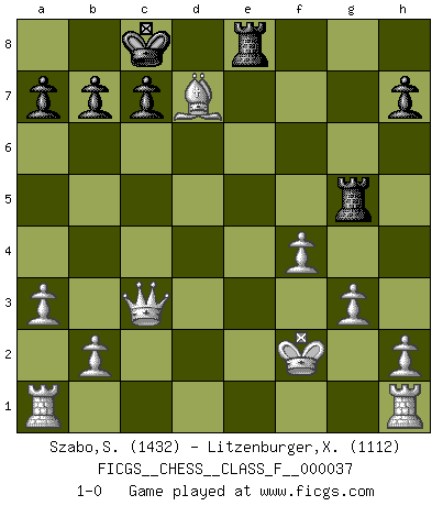 Last move : 1-0 2007 May 13 16:56:33 [Event "FICGS__CHESS__CLASS_F__000037"] [Site "FICGS"] [Date "2007.05.03"] [Round "1"] [White "Szabo,Sandor"] [Black "Litzenburger,Xavier"] [Result "1-0"] [WhiteElo "1432"] [BlackElo "1112"] 1.d4 d5 2.c4 e5 3.dxe5 Be6 4.cxd5 Bxd5 5.Nc3 Nc6 6.Qxd5 Bb4 7.Qb3 f6 8.exf6 Qd7 9.fxg7 Qxg7 10.Bf4 O-O-O 11.Nf3 Nf6 12.a3 Bxc3+ 13.Qxc3 Qd7 14.Bg5 Ne4 15.Qe3 Nxg5 16.Nxg5 Rhe8 17.Qc3 Re5 18.f4 Rf5 19.g3 Nd4 20.Bh3 Nxe2 21.Kxe2 Re8+ 22.Kf2 Rxg5 23.Bxd7+ 1-0 QGD : Albin counter-gambit Queenside Castling by player Black (move 10) Player White won this chess game. Follow this game move after move (download)The isolated Pawn casts gloom over the entire chessboard. (Aaron Nimzovich) Ich weiss nicht was Gott gegen mich auf 1.e4 antworten würde. (Robert James Fischer) El Ajedrez es despiadado: debes de estar preparado para matar gente. (Nigel Short) Des combinaisons [dans le jeu d'échecs] pareilles à des mélodies. Je crois entendre pour ainsi dire la musique des coups... (Vladimir Nabokov) Luck never gives; it only lends. (Swedish proverb)