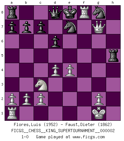 Last move : 1-0 2018 June 4 14:5:5 [Event "FICGS__CHESS__KING_SUPERTOURNAMENT__000002"] [Site "FICGS"] [Date "2018.05.01"] [Round "1"] [White "Flores,Luis"] [Black "Faust,Dieter"] [Result "1-0"] [WhiteElo "1952"] [BlackElo "1862"] 1.e4 e5 2.f4 exf4 3.Bc4 Nc6 4.Nf3 Be7 5.O-O d6 6.d4 g5 7.Nc3 Bg4 8.h3 h5 9.hxg4 hxg4 10.Nxg5 Bxg5 11.Bxf4 Bxf4 12.Bxf7+ Kxf7 13.Rxf4+ Ke8 14.Qxg4 Nce7 15.Qg7 Rh5 16.Rf8+ 1-0 KGA : Bishop's gambit, Maurian defense Kingside Castling by player White (move 5) Player White won this chess game. Follow this game move after move (download)I like to say that Bobby Fischer was the greatest player ever. But what made Fischer a genius was his ability to blend an American freshness and pragmatism with Russian ideas about strategy. (Bruce Pandolfini) Jeder leidlich begabte Spieler, er braucht keineswegs hervorragend veranlagt zu sein, kann es zum Meister bringen. Aber das ist ja auch gar nicht nötig! Der richtige Standpunkt ist es, zu seinem Vergnügen zu spielen, und man glaube ja nicht, dass der Genuss proportional dem Können sei. (Siegbert Tarrasch) Yo nunca en mi vida he jugado la Defensa Francesa, que viene siendo la más aburrida de todas las Aperturas. (Wilhelm Steinitz) Il s'avisa de me proposer d'apprendre les échecs qu'il jouait un peu... me voilà forcené des échecs. J'achète un échiquier, je m'enferme dans ma chambre, j'y passe des jours et des nuits à vouloir apprendre par cur toutes les parties. (Jean-Jacques Rousseau, Confessions) Always remember that you are unique; just like everyone else. (Unknown)
