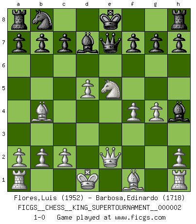 Last move : 1-0 2018 May 20 16:40:5 [Event "FICGS__CHESS__KING_SUPERTOURNAMENT__000002"] [Site "FICGS"] [Date "2018.05.01"] [Round "1"] [White "Flores,Luis"] [Black "Barbosa,Edinardo"] [Result "1-0"] [WhiteElo "1952"] [BlackElo "1718"] 1.e4 e5 2.f4 d5 3.exd5 e4 4.d3 Nf6 5.dxe4 Nxe4 6.Nf3 Bc5 7.Qe2 Bf2+ 8.Kd1 Qe7 9.Ne5 Bf5 10.Nd2 Nxd2 11.Bxd2 Bh4 12.g4 Bd7 13.Bb4 1-0 KGD : Falkbeer, 5.de Player White won this chess game. Follow this game move after move (download)Later, I began to succeed in decisive games. Perhaps because I realized a very simple truth: not only was I worried, but also my opponent. (Mikhail Tal) Irgendwie scheint mir sonntags früh um 9 Uhr der Killerinstinkt verloren gegangen zu sein. (Alexej Shirov) Un jugador que es sorprendido, esta derrotado a medias. (Proverbio) Il vaut toujours mieux jouer un plan faux de façon logique que de n'avoir pas de plan du tout. (Victor Kortchnoï) When you stop learning you start dying. (M. Scott Adams)