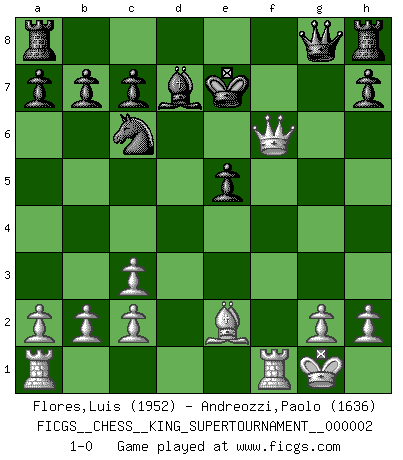 Last move : 1-0 2018 May 31 10:1:35 [Event "FICGS__CHESS__KING_SUPERTOURNAMENT__000002"] [Site "FICGS"] [Date "2018.05.01"] [Round "1"] [White "Flores,Luis"] [Black "Andreozzi,Paolo"] [Result "1-0"] [WhiteElo "1952"] [BlackElo "1636"] 1.e4 e5 2.f4 Nc6 3.Nc3 Bb4 4.Nf3 exf4 5.Bc4 Nh6 6.O-O Bxc3 7.dxc3 Na5 8.Be2 d6 9.Bxf4 Bd7 10.Bg5 f6 11.Bxh6 gxh6 12.Qd5 Nc6 13.Qh5+ Ke7 14.Qxh6 Qg8 15.e5 dxe5 16.Nxe5 fxe5 17.Qf6+ 1-0 King's gambit Kingside Castling by player White (move 6) Player White won this chess game. Follow this game move after move (download)No one ever won a game by resigning. (Unknown) Die FIDE ist dabei in die Hände der russischen Mafia zu fallen. (Larry Evans) De todos mis libros Rusos, la defensa contiene y difunde el 'calor' mas grande que pudiese verse extraño al observar lo supremamente abstracto que el Ajedrez supuestamente es. (Vladimir Nabokov) Les Echecs ne sont pas pour les âmes timides. Ils requièrent un homme entier, qui ne s'arrête pas aveuglément à ce qui a été déjà établi, mais qui tente individuellement de sonder les profondeurs du jeu. (W. Steinitz) A shortcut is the longest distance between two points. (Don Groves)