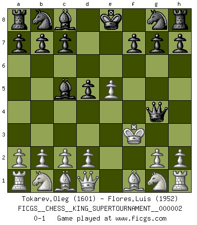Last move : 0-1 2018 June 12 14:34:15 [Event "FICGS__CHESS__KING_SUPERTOURNAMENT__000002"] [Site "FICGS"] [Date "2018.05.01"] [Round "1"] [White "Tokarev,Oleg"] [Black "Flores,Luis"] [Result "0-1"] [WhiteElo "1601"] [BlackElo "1952"] 1.e4 e5 2.f4 d5 3.fxe5 Qh4+ 4.Ke2 Qxe4+ 5.Kf2 Bc5+ 6.Kg3 Qg6+ 7.Kf3 Qg4+ 0-1 This chess game has been lost on time (started : 2018.05.01 22:10:15) KGD : Falkbeer counter-gambit Player Black won this chess game. Follow this game move after move (download)I have added these principles to the law: get the Knights into action before both Bishops are developed. (Emanuel Lasker) Schach ist eine Sache der genauen Beurteilung, wann man zuschlagen und wann man sich ducken muss. (Robert James Fischer) Una partida de Ajedrez se divide en 3 etapas: la primera cuando piensas que tienes la ventaja, la segunda cuando crees que tienes la ventaja y la tercera... ¡cuando te das cuenta que vas a perder!. (Savielly Tartakower) Comme les marins qui ont mille raisons différentes d'aller en mer, les joueurs d'échecs en ont tout autant avant de s'installer devant une table et jouer... (Vincent Bertignac, philosophe) Good decisions come from experience, and experience comes from bad decisions. (Anonymous)