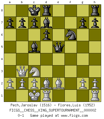 Last move : 0-1 2018 June 22 15:50:17 [Event "FICGS__CHESS__KING_SUPERTOURNAMENT__000002"] [Site "FICGS"] [Date "2018.05.01"] [Round "1"] [White "Pech,Jaroslav"] [Black "Flores,Luis"] [Result "0-1"] [WhiteElo "1516"] [BlackElo "1952"] 1.e4 e5 2.f4 Nc6 3.Nf3 f5 4.exf5 e4 5.Ne5 Nf6 6.Nc3 Qe7 7.Be2 Nxe5 8.fxe5 Qxe5 9.d4 exd3 10.Qxd3 Bc5 11.Bd2 d6 12.O-O-O Bxf5 13.Qb5+ Bd7 14.Qb3 O-O-O 0-1 This chess game has been lost on time (started : 2018.05.01 22:10:15) King's gambit Queenside Castling by player White (move 12) Queenside Castling by player Black (move 14) Player Black won this chess game. Follow this game move after move (download)Tactics flow from a superior position. (Bobby Fischer) Ich suche im Schach immer etwas Eigenes. Riskantes Spiel im Stile schachlicher Musketiere ist nicht meine Sache, auch wenn es vielen Freunden scharfer Wendungen gefällt. (Anatoly Karpov) Antes de los Finales, los dioses han colocado el Juego Medio. (Siegbert Tarrasch) Shah mat. Le roi est mort. Cri de fierté d'un joueur venant de terrasser son adversaire, courtoisement, sans effusion de sang. The Internet is the world's largest library. It's just that all the books are on the floor. (John Allen Paulos)