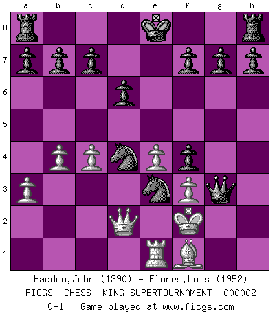 Last move : 0-1 2018 June 12 0:7:14 [Event "FICGS__CHESS__KING_SUPERTOURNAMENT__000002"] [Site "FICGS"] [Date "2018.05.01"] [Round "1"] [White "Hadden,John"] [Black "Flores,Luis"] [Result "0-1"] [WhiteElo "1290"] [BlackElo "1952"] 1.e4 e5 2.f4 exf4 3.d3 Qh4+ 4.Kd2 Nf6 5.Nf3 Qh6 6.Nc3 Bb4 7.a3 Ba5 8.b4 Bb6 9.Bb2 Be3+ 10.Ke2 d6 11.Nd5 Nxd5 12.c4 Nf6 13.Bc1 Ng4 14.Bxe3 Nxe3 15.Qd2 Bg4 16.Kf2 Bxf3 17.gxf3 Nc6 18.d4 Qf6 19.Rg1 Nxd4 20.Re1 Qh4+ 21.Rg3 Qxh2+ 22.Rg2 Qh4+ 23.Rg3 Qxg3+ 0-1 King's gambit accepted Player Black won this chess game. Follow this game move after move (download)Chess is the art of analysis. (Mikhail Botvinnik) Ein Buch ist ein Spiegel; wenn ein Affe hineinsieht, so kann kein Apostel heraus gucken. (Georg Christoph Lichtenberg) Un Peón pasado aumenta su poder a medida de que el número de piezas en el tablero disminuye. (Capablanca) La tactique, c'est ce que vous faites quand il y a quelque chose à faire; la stratégie, c'est ce que vous faites quand il n'y a rien à faire. (Savielli Tartacower) Games, world of games... There's always an opponent, and there's always a victim. (Revolver, movie)
