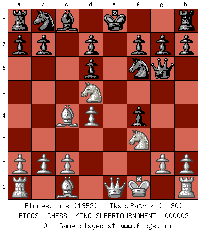 Last move : 1-0 2018 June 17 15:9:37 [Event "FICGS__CHESS__KING_SUPERTOURNAMENT__000002"] [Site "FICGS"] [Date "2018.05.01"] [Round "1"] [White "Flores,Luis"] [Black "Tkac,Patrik"] [Result "1-0"] [WhiteElo "1952"] [BlackElo "1130"] 1.e4 e5 2.f4 exf4 3.Bc4 Qh4+ 4.Kf1 Bc5 5.d4 Bb4 6.Nf3 Qf6 7.Nc3 Bd6 8.e5 Qg6 9.exd6 cxd6 10.Nd5 Nf6 11.Qe1+ 1-0 This chess game has been lost on time (started : 2018.05.01 22:10:15) KGA : Bishop's gambit, Greco variation Player White won this chess game. Follow this game move after move (download)I play correspondence chess because it is both art and science while chess is art only. (A player at FICGS) Ich verstehe mehr vom Schach als irgendein anderer lebender Meister. (José Raúl Capablanca) Robert Fischer es la ley hacia si mismo. (Larry Evans) Même si l'adversaire joue le coup analysé précédemment, recommencez l'analyse en voyant la nouvelle position. Première règle de Blumenfeld The beginning is the most important part of the work. (Plato)