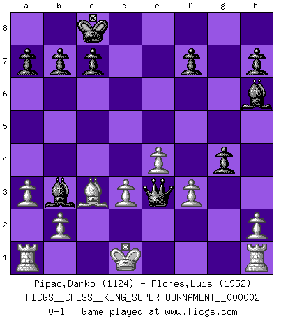 Last move : 0-1 2018 June 14 0:7:18 [Event "FICGS__CHESS__KING_SUPERTOURNAMENT__000002"] [Site "FICGS"] [Date "2018.05.01"] [Round "1"] [White "Pipac,Darko"] [Black "Flores,Luis"] [Result "0-1"] [WhiteElo "1124"] [BlackElo "1952"] 1.e4 e5 2.f4 exf4 3.d3 Qh4+ 4.Kd2 Nf6 5.Nf3 Qh6 6.a3 d5 7.Nc3 dxe4 8.Nxe4 Nxe4+ 9.dxe4 Be6 10.Ke2 Nc6 11.Qd2 g5 12.Qc3 Rg8 13.Qd3 g4 14.Nd4 O-O-O 15.Bd2 Rxd4 16.Qc3 Rc4 17.Qd3 Ne5 18.Qxc4 Nxc4 19.Bc3 f3+ 20.gxf3 Qe3+ 21.Kd1 Bh6 22.Bxc4 Rd8+ 23.Bd3 Rxd3+ 24.cxd3 Bb3+ 0-1 King's gambit accepted Queenside Castling by player Black (move 14) Player Black won this chess game. Follow this game move after move (download)There are two types of sacrifices: correct ones and mine. (Mikhail Tal) Wenn Du einsam bist, wenn Du Dich in der Welt wie ein Fremder fühlst, spiele Schach. Das wird Deinen Geist erheben und Dein Ratgeber im Kampf sein. (Aristoteles) Hoy en día, si tu no eres un Gran Maestro a los 14 años, es mejor que lo olvides. (Anand Viswanathan) Les échecs sont plus proches de l'art de l'assassinat que de l'art de la guerre. (Arturo Perez-Reverte) Life is pain my dear and anyone who says otherwise is selling something. (Princess Bride)