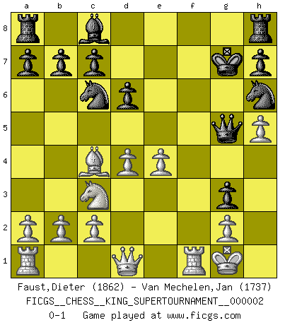 Last move : 0-1 2018 June 5 16:32:0 [Event "FICGS__CHESS__KING_SUPERTOURNAMENT__000002"] [Site "FICGS"] [Date "2018.05.01"] [Round "1"] [White "Faust,Dieter"] [Black "Van Mechelen,Jan"] [Result "0-1"] [WhiteElo "1862"] [BlackElo "1737"] 1.e4 e5 2.f4 exf4 3.Nf3 g5 4.h4 g4 5.Ne5 d6 6.Nxf7 Kxf7 7.Bc4+ Kg7 8.h5 Nh6 9.d4 Be7 10.Bxf4 Bg5 11.Bxg5 Qxg5 12.O-O Nc6 13.Nc3 g3 0-1 KGA : Kieseritsky, Kolisch defense Kingside Castling by player White (move 12) Player Black won this chess game. Follow this game move after move (download)Fischer Chess play was always razor-sharp, rational and brilliant. One of the best ever. (Dave Regis) Ich las kürzlich ein Buch von Nietzsche. Er sagte Religion verdumme nur die Menschen. Ich stimme zu. (Robert James Fischer) Cuando le juegas a Fischer, no es una cuestion de si vas a ganar o perder. Es una cuestion de si vas a sobrevivir. (Boris Spassky) Tous ces prétendus hommes politiques sont les pions, les Cavaliers, les Tours ou les Fous d'une partie d'échecs qui se jouera tant qu'un hasard ne renversera pas l'échiquier. (Honoré de Balzac) No man has ever achieved immortality in his own life time. (Unknown)