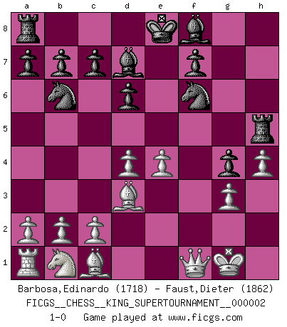 Last move : 1-0 2018 June 2 9:49:6 [Event "FICGS__CHESS__KING_SUPERTOURNAMENT__000002"] [Site "FICGS"] [Date "2018.05.01"] [Round "1"] [White "Barbosa,Edinardo"] [Black "Faust,Dieter"] [Result "1-0"] [WhiteElo "1718"] [BlackElo "1862"] 1.e4 e5 2.f4 exf4 3.Nf3 g5 4.h4 g4 5.Ne5 h5 6.Bc4 Nh6 7.d4 d6 8.Nd3 Qf6 9.Nxf4 Ng8 10.g3 Nd7 11.O-O Nb6 12.Nxh5 Rxh5 13.Rxf6 Nxf6 14.Bd3 Bd7 15.Qf1 1-0 KGA : Kieseritsky, long whip (Stockwhip, Classical) defense Kingside Castling by player White (move 11) Player White won this chess game. Follow this game move after move (download)After a bad opening, there is hope for the middle game. After a bad middle game, there is hope for the endgame. But once you are in the endgame, the moment of truth has arrived. (Edmar Mednis) Schach wird sich dank seiner hohen kulturellen Tradition immer durchsetzen. In näherer Zukunft womöglich sogar als Gegenreaktion auf die maßlose Reizüberflutung im Freizeit- und Spielbereich. (Garry Kasparov) La caracteristica mas importante en la posición del Ajedrez es la actividad de las piezas. Esto es absolutamente fundamental en todas las fases del juego: Apertura, Juego Medio y especialmente Finales. La limitación primordial en la actividad de una pieza, es la estructuración de los Peones. (Michael Stean) Le thème de l'attaque double intervient d'une manière ou d'une autre dans l'immense majorité des combinaisons. (Youri Averbakh) If I had no sense of humor, I would long ago have committed suicide. (Mahatma Gandhi)