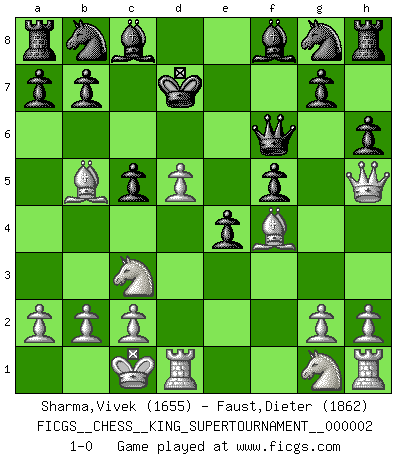 Last move : 1-0 2018 May 23 9:30:58 [Event "FICGS__CHESS__KING_SUPERTOURNAMENT__000002"] [Site "FICGS"] [Date "2018.05.01"] [Round "1"] [White "Sharma,Vivek"] [Black "Faust,Dieter"] [Result "1-0"] [WhiteElo "1655"] [BlackElo "1862"] 1.e4 e5 2.f4 exf4 3.d4 d5 4.Bxf4 dxe4 5.Nc3 f5 6.Bb5+ c6 7.Bc4 h6 8.Qh5+ Kd7 9.O-O-O Qf6 10.d5 c5 11.Bb5+ 1-0 KGA : Villemson (Steinitz) gambit Queenside Castling by player White (move 9) Player White won this chess game. Follow this game move after move (download)Chess is mental torture. (Garry Kasparov) Ohne Leiden bildet sich kein Charakter. (Ernst Freiherr von Feuchtersleben) Bendita sea la memoria de aquel que dio al mundo este juego inmortal. (A. G. Gardiner) D'abord les bases : Jouez et étudiez, puis étudiez et jouez, ensuite jouez et étudiez, puis étudiez et jouez. Deuxièmement : Donnez toujours le meilleur de vous-même ! (Ken Smith) If computers get too powerful, we can organize them into committees. That'll do them in. (Anonymous)