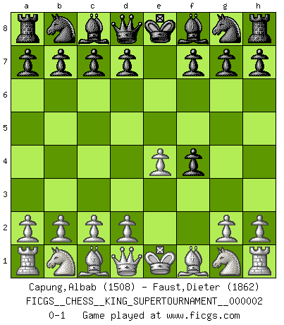 Last move : 0-1 2018 June 20 15:22:35 [Event "FICGS__CHESS__KING_SUPERTOURNAMENT__000002"] [Site "FICGS"] [Date "2018.05.01"] [Round "1"] [White "Capung,Albab"] [Black "Faust,Dieter"] [Result "0-1"] [WhiteElo "1508"] [BlackElo "1862"] 1.e4 e5 2.f4 exf4 0-1 This chess game has been lost on time (started : 2018.05.01 22:10:15) King's gambit accepted Player Black won this chess game. Follow this game move after move (download)Why must I lose to this idiot ? (Aron Nimzovich) Mutter, ich bin eben Ex-Weltmeister geworden. --beim nach Hause Kommen nach dem Verlust des WM-Titels an Mihail Botvinnik -- (Mikhail Nekhemyevich Tal) El Ajedrez es parte de la cultura, y si una cultura esta en decadencia, entonces también el Ajedrez declinará. (Mikhail Botvinnik) Un footballeur joue avec ses pieds, parfois avec sa tête. Un joueur d'échecs ne joue qu'avec sa tête. Et quand il ne joue plus, il meurt. (Jacob Murray) Players are not good because they find tactics, it is about the way to find the positions in which those tactics are hidden. (Luc-Olivier Leclerc)