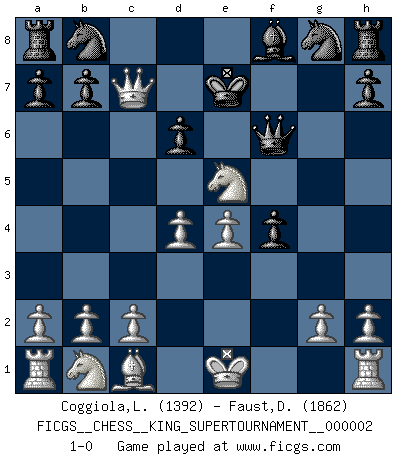 Last move : 1-0 2018 May 26 16:3:0 [Event "FICGS__CHESS__KING_SUPERTOURNAMENT__000002"] [Site "FICGS"] [Date "2018.05.01"] [Round "1"] [White "Coggiola,Leandro Damian"] [Black "Faust,Dieter"] [Result "1-0"] [WhiteElo "1392"] [BlackElo "1862"] 1.e4 e5 2.f4 exf4 3.Nf3 g5 4.Bc4 g4 5.Bxf7+ Kxf7 6.Ne5+ Ke8 7.Qxg4 Qf6 8.d4 d6 9.Qxc8+ Ke7 10.Qxc7+ 1-0 KGA : Lolli gambit (wild Muzio gambit) Player White won this chess game. Follow this game move after move (download)No Chess Grandmaster is normal; they only differ in the extent of their madness. (Viktor Korchnoi) Ja, jede Frau in Holland liebt mich bestimmt, und alle Männer hassen mich. (Loek van Wely) Hasta este punto, las blancas han seguido un análisis bien conocido. Pero ahora el hace un error fatal: empieza a usar su propia cabeza. (Siegbert Tarrasch) On croit qu'il y a plus de mauvais joueurs que de bons joueurs, c'est faux : Il y a autant de joueurs qui gagnent que de joueurs qui perdent. (Philippe Geluck) When you've done things right people won't know you've done anything at all. (Futurama)