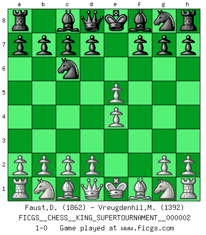 Last move : 1-0 2018 June 21 15:30:2 [Event "FICGS__CHESS__KING_SUPERTOURNAMENT__000002"] [Site "FICGS"] [Date "2018.05.01"] [Round "1"] [White "Faust,Dieter"] [Black "Vreugdenhil,Maarten"] [Result "1-0"] [WhiteElo "1862"] [BlackElo "1392"] 1.e4 e5 2.f4 Nc6 3.fxe5 1-0 This chess game has been lost on time (started : 2018.05.01 22:10:15) King's gambit Player White won this chess game. Follow this game move after move (download)Chess is everything: art, science and sport. (Anatoly Karpov) Ich war schon mal beim Dopingtest. Da musste ich Urin abgeben, während Dritte zusahen. (Elisabeth Pähtz) Con o sin el título, Bobby Fischer fue sin lugar a dudas el mas grande jugador de su época. (Burt Hochberg) A chaque perte on perd un peu de soi. (Joël Lautier) A computer lets you make more mistakes faster than any invention in human history - with the possible exceptions of handguns and tequila. (Mitch Ratcliffe)