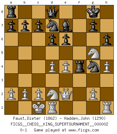 Last move : 0-1 2018 June 11 11:15:10 [Event "FICGS__CHESS__KING_SUPERTOURNAMENT__000002"] [Site "FICGS"] [Date "2018.05.01"] [Round "1"] [White "Faust,Dieter"] [Black "Hadden,John"] [Result "0-1"] [WhiteElo "1862"] [BlackElo "1290"] 1.e4 e5 2.f4 exf4 3.Nf3 d6 4.Bc4 Be6 5.Bxe6 fxe6 6.d4 Nf6 7.Qe2 Nbd7 8.Bxf4 Be7 9.Nbd2 h6 10.O-O-O O-O 11.h4 Ng4 12.Ng5 Rxf4 0-1 KGA : Fischer defense Queenside Castling by player White (move 10) Kingside Castling by player Black (move 10) Player Black won this chess game. Follow this game move after move (download)All that matters on the Chessboard is good moves. (Bobby Fischer) Im Blitz ist es einfacher mit einer Figur weniger anzugreifen, als sich mit einer Mehrfigur zu verteidigen. (Mikhail Nekhemyevich Tal) Un jugador que trata de regresar una movida en el Ajedrez es un futuro carterista. (Richard Fenton) Il n'y a pas eu de défaite parce que je ne crois pas que cet ordinateur ait jamais existé. IBM a triché en refusant d'imprimer les modes de recherche de la machine. C'est évident, pendant le match, des coups décisifs ont été joués par des êtres humains. Aujourd'hui, les meilleurs spécialistes en informatique ne peuvent toujours pas expliquer comment Deep-Blue a pu jouer contre la logique des ordinateurs. IBM a gagné une guerre de communication, mais ils sont incapables de prouver que l'ordinateur a gagné tout seul. (Garry Kasparov) The real voyage of discovery consists not in seeking new lands but in seeing with new eyes. (Marcel Proust)