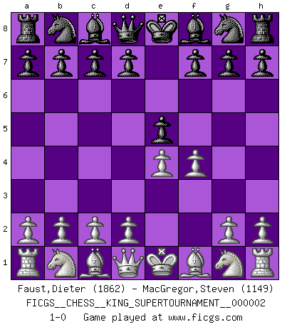 Last move : 1-0 2018 June 1 0:38:7 [Event "FICGS__CHESS__KING_SUPERTOURNAMENT__000002"] [Site "FICGS"] [Date "2018.05.01"] [Round "1"] [White "Faust,Dieter"] [Black "MacGregor,Steven"] [Result "1-0"] [WhiteElo "1862"] [BlackElo "1149"] 1.e4 e5 2.f4 1-0 This chess game has been lost on time (started : 2018.05.01 22:10:15) King's gambit Player White won this chess game. Follow this game move after move (download)Everything is in a state of flux, and this includes the world of Chess. (Mikhail Botvinnik) Bobby Fischer ist kein Vorbild für die heutige Jugend. (Viktor Kortschnoi) Ciertamente el estado mental actual de Bobby Fischer es una tragedia. Uno de los mas grandes jugadores de Ajedrez del mundo -el orgullo y pena del Ajedrez Americano. (Frank Brady) Tout change constamment, y compris dans le monde des Echecs. (Botvinnik) Perhaps the current trend of many chess professionals taking up the more lucrative pastime of poker is not a wholly negative one. It may not be too late for humans to relearn how to take risks in order to innovate and thereby maintain the advanced lifestyles we enjoy. And if it takes a poker-playing supercomputer to remind us that we can't enjoy the rewards without taking the risks, so be it. (The Chess Master and the Computer, by Garry Kasparov - 2010)