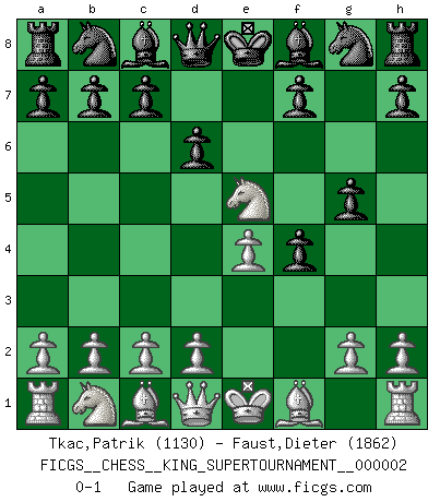 Last move : 0-1 2018 June 23 3:52:0 [Event "FICGS__CHESS__KING_SUPERTOURNAMENT__000002"] [Site "FICGS"] [Date "2018.05.01"] [Round "1"] [White "Tkac,Patrik"] [Black "Faust,Dieter"] [Result "0-1"] [WhiteElo "1130"] [BlackElo "1862"] 1.e4 e5 2.f4 exf4 3.Nf3 g5 4.Ne5 d6 0-1 This chess game has been lost on time (started : 2018.05.01 22:10:15) King's knight's gambit Player Black won this chess game. Follow this game move after move (download)Chess is a fairy tale of 1001 blunders. (Savielly Tartakower) Im Schach nämlich geht es darum, daß Ich des Gegners klein zu kriegen, sein Ego zu zerbrechen und zu zermahlen, seine Selbstachtung zu zertreten und zu verscharren und seine ganze mißachtenswerte sogenannte Persönlichkeit ein für alle Mal tot zu hacken und zu zerstampfen und dadurch die menschliche Gesellschaft von einer stinkenden Pestbeule zu befreien. Es ist ein königliches Spiel. (Robert James Fischer) ¿Se han dado cuenta de que Fischer casi nunca ha tenido piezas malas? El las intercambia y las piezas malas se quedan con sus oponenets. (Yuri Balashov) Votre seul travail dans les ouvertures est d'obtenir un milieu de partie jouable. (Lajos Portish) A cynic is a man who knows the price of everything but the value of nothing. (Oscar Wilde)