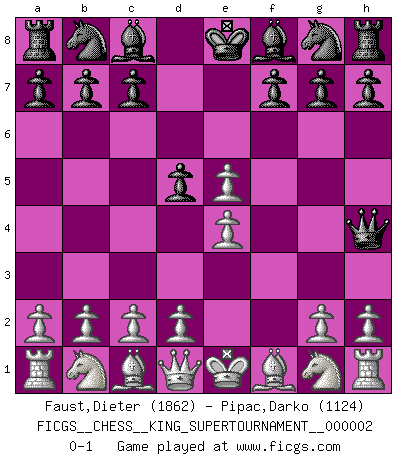 Last move : 0-1 2018 May 27 18:54:12 [Event "FICGS__CHESS__KING_SUPERTOURNAMENT__000002"] [Site "FICGS"] [Date "2018.05.01"] [Round "1"] [White "Faust,Dieter"] [Black "Pipac,Darko"] [Result "0-1"] [WhiteElo "1862"] [BlackElo "1124"] 1.e4 e5 2.f4 d5 3.fxe5 Qh4+ 0-1 KGD : Falkbeer counter-gambit Player Black won this chess game. Follow this game move after move (download)Chess is really ninety nine percent calculation. (Soltis) Das typische an einem Großmeister ist, daß er eine gewonnene Position schnell und schmerzlos gewinnt. (Irving Chernev) Alekhine es un poeta que crea un trabajo de arte de algo que raramente inspiraría a otra persona a mandar una tarjeta postal. (Max Euwe) Il s'avisa de me proposer d'apprendre les échecs qu'il jouait un peu... me voilà forcené des échecs. J'achète un échiquier, je m'enferme dans ma chambre, j'y passe des jours et des nuits à vouloir apprendre par cur toutes les parties. (Jean-Jacques Rousseau, Confessions) In fact if nothing is done against this teddy bear, hereby I announce that I would quit chess, rapid chess, blitz chess, postal chess, email chess, server chess and correspondence chess I will then switch to a table game where teddy bears aren't going to be seen for a while, like Poker, or Roulette, all 18+ games. (Elmer Valderrama)