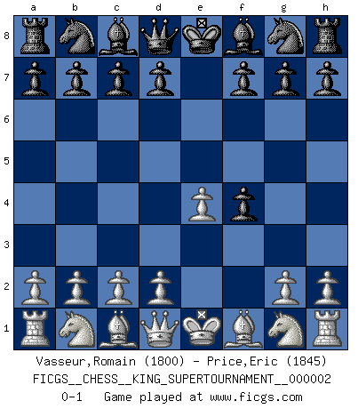 Last move : 0-1 2018 June 1 0:38:7 [Event "FICGS__CHESS__KING_SUPERTOURNAMENT__000002"] [Site "FICGS"] [Date "2018.05.01"] [Round "1"] [White "Vasseur,Romain"] [Black "Price,Eric"] [Result "0-1"] [WhiteElo "1800"] [BlackElo "1845"] 1.e4 e5 2.f4 exf4 0-1 This chess game has been lost on time (started : 2018.05.01 22:10:15) King's gambit accepted Player Black won this chess game. Follow this game move after move (download)There is no remorse like the remorse of Chess. (H. G. Wells) Das Schachspiel ist ein See, in welchem eine Mücke baden und ein Elefant ertrinken kann. (Emanuel Lasker) El ganar no lo es todo... pero el perder es nada. (Mednis) Les échecs sont un jeu par leur forme, un art par leur essence et une science par sa difficulté d'acquisition. Ils peuvent vous procurer autant de plaisir qu'un bon livre ou une belle musique, mais vous n'aurez une réelle joie que si vous arrivez à bien jouer. (Tigran Petrosian) The difference between perseverance and obstinacy is that one comes from a strong will, and the other from a strong won't. (Henry Ward Beecher)
