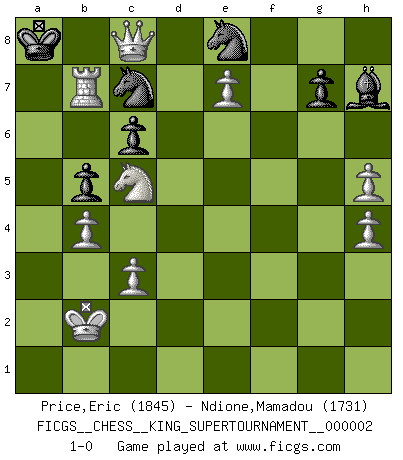 Last move : 1-0 2018 July 7 14:9:36 [Event "FICGS__CHESS__KING_SUPERTOURNAMENT__000002"] [Site "FICGS"] [Date "2018.05.01"] [Round "1"] [White "Price,Eric"] [Black "Ndione,Mamadou"] [Result "1-0"] [WhiteElo "1845"] [BlackElo "1731"] 1.e4 e5 2.f4 d5 3.exd5 Qxd5 4.Nc3 Qd4 5.Nf3 Qd8 6.fxe5 Bg4 7.d4 c6 8.Be3 h6 9.Qd2 Bb4 10.a3 Ba5 11.b4 Bc7 12.Bc4 Nd7 13.Rf1 f5 14.exf6 Ngxf6 15.O-O-O b5 16.Ba2 a5 17.h3 Bh5 18.Qf2 axb4 19.axb4 Bg6 20.Ne5 Bxe5 21.dxe5 Rxa2 22.Nxa2 Nd5 23.e6 N7f6 24.Bc5 Qa8 25.Kb2 Qb8 26.g4 Qe5+ 27.c3 Qc7 28.Nc1 Kd8 29.Bb6 Kc8 30.Bxc7 Nxc7 31.e7 Kb7 32.Rd8 Re8 33.Rxe8 Nfxe8 34.Nb3 Nf6 35.Ra1 Be8 36.Ra7+ Kc8 37.Nc5 Bg6 38.Qf4 Nfe8 39.h4 h5 40.gxh5 Bh7 41.Qg4+ Kb8 42.Rb7+ Ka8 43.Qc8+ 1-0 KGD : Falkbeer counter-gambit Queenside Castling by player White (move 15) Player White won this chess game. Follow this game move after move (download)There's never before been a Chess player with such a thorough knowledge of the intricacies of the game and such an absolutely indomitable will to win. I think Bobby is the greatest player that ever lived. (Lisa Lane) Besser ein falscher Plan, logisch durchgeführt, als gar kein Plan. (Viktor Kortschnoi) Botvinnik trató de alejar el misterio referente al Ajedrez, siempre relacionandolo a situaciones de la vida diaria. Solía llamar al Ajedrez un problema inexacto típico, similar a aquellos en que la gente tiene siempre que resolver a cada día. (Garry Kasparov) Je ne crois pas en la psychologie, je crois aux bons coups. (Robert Fischer) Being number two sucks. (Andre Agassi)