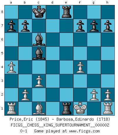 Last move : 0-1 2018 May 30 2:18:38 [Event "FICGS__CHESS__KING_SUPERTOURNAMENT__000002"] [Site "FICGS"] [Date "2018.05.01"] [Round "1"] [White "Price,Eric"] [Black "Barbosa,Edinardo"] [Result "0-1"] [WhiteElo "1845"] [BlackElo "1718"] 1.e4 e5 2.f4 d5 3.exd5 e4 4.d3 Nf6 5.dxe4 Nxe4 6.Nf3 Bc5 7.Qe2 Bf5 8.Nc3 Qe7 9.Nxe4 Qxe4 10.Qxe4+ Bxe4 11.Bb5+ c6 12.dxc6 Nxc6 13.c3 O-O-O 14.a4 Rhe8 15.Bxc6 Bxc6 16.Kf1 Rd1+ 17.Ne1 Rdxe1+ 0-1 KGD : Falkbeer, Main line, 7...Bf5 Queenside Castling by player Black (move 13) Player Black won this chess game. Follow this game move after move (download)No price is too great for the scalp of the enemy King. (Koblentz) Zum Sieg gelangt man nicht, wenn man gut, sondern nur wenn man besser spielt (Savielly Grigorievitsch Tartakower) Si pudieramos observar el interior de la cabeza de un jugador de Ajedrez, encontraríamos ahí un mundo lleno de sentimientos, imágenes, ideas, emoción y pasión. (Alfred Binet) Le jeu d'échecs fait naître et fortifie en nous plusieurs qualités précieuses dans le cours de l'existence, telles que la prévoyance, la circonspection, la prudence, et la persévérance. (Benjamin Franklin - 1783, la morale des échecs) When you stop learning you start dying. (Scott Adams)