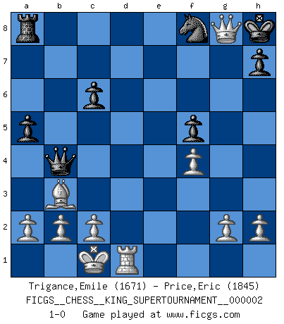 Last move : 1-0 2018 July 8 13:25:21 [Event "FICGS__CHESS__KING_SUPERTOURNAMENT__000002"] [Site "FICGS"] [Date "2018.05.01"] [Round "1"] [White "Trigance,Emile"] [Black "Price,Eric"] [Result "1-0"] [WhiteElo "1671"] [BlackElo "1845"] 1.e4 e5 2.f4 d5 3.exd5 e4 4.d3 Nf6 5.dxe4 Nxe4 6.Nf3 Bc5 7.Qe2 Bf5 8.Nc3 Qe7 9.Be3 Bxe3 10.Qxe3 O-O 11.O-O-O Re8 12.Bb5 c6 13.dxc6 bxc6 14.Ba4 Qf8 15.Rhe1 Nxc3 16.Qxc3 a5 17.Re5 Rxe5 18.Qxe5 g6 19.Nd4 Nd7 20.Qc7 Qb4 21.Nxf5 gxf5 22.Bb3 Nf8 23.Qxf7+ Kh8 24.Qg8+ 1-0 KGD : Falkbeer, Main line, 7...Bf5 Kingside Castling by player Black (move 10) Queenside Castling by player White (move 11) Player White won this chess game. Follow this game move after move (download)If your opponent offers you a draw, try to work out why he thinks he's worse off. (Nigel Short) Ein typischer, sehr verbreiteter Gedankenschädling ist der, daß der betreffende Amateur von der Annanhme ausgeht, daß jeder einzelne Zug etwas zu leisten habe. (Aaron Nimzowitsch) El hombre es un frívolo, una creatura engañosa y como un jugador de Ajedrez, se preocupa mas por el proceso de obtener su meta que de la meta por sí misma. (Dostoyevsky) J'ai vu le vaincu d'Echecs jouer des années durant dans l'espoir de la fête de la victoire. Car tu es plus riche de ce qu'elle existe si même elle n'est point pour toi. Ainsi de la perle du fond des mers. (Antoine de Saint-Exupéry) Mandala - that's it! 16x16 squares as multiple of the four and the eight because of the Four Noble Truths and the Noble Eightfold Path. (Heinz-Georg Lehnhoff about Big Chess)