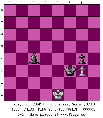 Last move : 0-1 2018 August 16 20:42:0 [Event "FICGS__CHESS__KING_SUPERTOURNAMENT__000002"] [Site "FICGS"] [Date "2018.05.01"] [Round "1"] [White "Price,Eric"] [Black "Andreozzi,Paolo"] [Result "0-1"] [WhiteElo "1845"] [BlackElo "1636"] 1.e4 e5 2.f4 d6 3.Nf3 Nc6 4.Bc4 h6 5.O-O Nf6 6.Nc3 Be7 7.d4 exd4 8.Nxd4 O-O 9.Nxc6 bxc6 10.e5 dxe5 11.Qxd8 Rxd8 12.fxe5 Nd5 13.Ne4 Be6 14.Ba6 Nb4 15.Bd3 Nxd3 16.cxd3 Rxd3 17.Bf4 g5 18.Bg3 Re3 19.Nf6+ Kg7 20.Rae1 Rxe1 21.Bxe1 Rd8 22.Bc3 Bxf6 23.exf6+ Kg6 24.a3 c5 25.Kf2 g4 26.Ke3 Kg5 27.g3 Bc4 28.Rf4 Rd3+ 29.Kf2 Bd5 30.Ke2 c4 31.Bd2 Kg6 32.Rxg4+ Kxf6 33.Bc3+ Ke6 34.Rf4 f5 35.g4 fxg4 36.Rf6+ Ke7 37.Rxh6 Bf3+ 38.Kf2 Kd7 39.Ra6 Rd6 40.Rxa7 Rh6 41.Be5 Rh5 42.Rxc7+ Ke6 43.Bg3 Rb5 44.Rxc4 Rxb2+ 45.Kf1 Be2+ 46.Ke1 Bxc4 47.a4 Ra2 48.a5 Rxa5 49.Kd2 Ra3 50.Kc2 Kf5 51.Kd2 Rxg3 52.hxg3 Ke4 53.Ke1 Kf3 0-1 King's gambit Kingside Castling by player White (move 5) Kingside Castling by player Black (move 8) 10 pieces endgame at move 44 : White KRBPPP , Black KRBP WHITE : King + 1 Rook 1 Bishop 3 Pawns BLACK : King + 1 Rook 1 Bishop 1 Pawn 9 pieces endgame at move 44 : White KRBPP , Black KRBP WHITE : King + 1 Rook 1 Bishop 2 Pawns BLACK : King + 1 Rook 1 Bishop 1 Pawn 8 pieces endgame at move 46 : White KBPP , Black KRBP WHITE : King + 1 Bishop 2 Pawns BLACK : King + 1 Rook 1 Bishop 1 Pawn 7 pieces endgame at move 48 : White KBP , Black KRBP WHITE : King + 1 Bishop 1 Pawn BLACK : King + 1 Rook 1 Bishop 1 Pawn 6 pieces endgame at move 51 : White KP , Black KRBP WHITE : King + 1 Pawn BLACK : King + 1 Rook 1 Bishop 1 Pawn 5 pieces endgame at move 52 : White KP , Black KBP WHITE : King + 1 Pawn BLACK : King + 1 Bishop 1 Pawn Player Black won this chess game. Follow this game move after move (download)You can only get good at Chess if you love the game. (Bobby Fischer) Als ich elf wurde, wurde ich einfach gut. (Robert James Fischer) No todos los artistas son jugadores de Ajedrez, pero todos los jugadores de Ajedrez son artistas. (Marcel Duchamp) Les échecs sont un jeu terrible. Si vous n'avez pas le centre, votre adversaire a une position plus libre. Par contre, si vous avez le centre, alors vous avez vraiment quelque chose pour laquelle vous inquiéter ! (Siegbert Tarrasch) Without enthusiasm, virtue functions not at all, and vice only poorly. (Mignon McLaughlin, The Neurotic's Notebook, 1960)