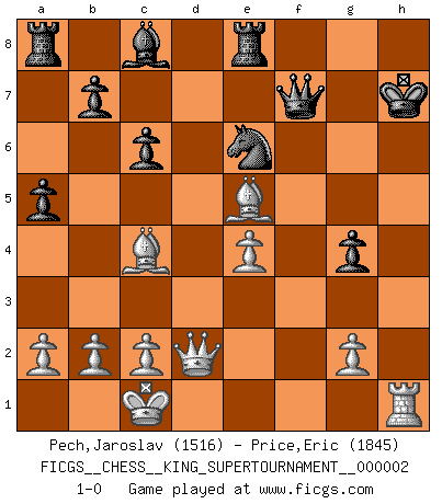 Last move : 1-0 2018 July 28 23:4:9 [Event "FICGS__CHESS__KING_SUPERTOURNAMENT__000002"] [Site "FICGS"] [Date "2018.05.01"] [Round "1"] [White "Pech,Jaroslav"] [Black "Price,Eric"] [Result "1-0"] [WhiteElo "1516"] [BlackElo "1845"] 1.e4 e5 2.f4 exf4 3.Nf3 d6 4.d4 g5 5.h4 g4 6.Ng5 f6 7.Bxf4 fxg5 8.hxg5 Be7 9.Qd2 Nc6 10.Nc3 Nf6 11.gxf6 Bxf6 12.Nd5 Nxd4 13.O-O-O Ne6 14.Bb5+ c6 15.Nxf6+ Qxf6 16.Rh6 Qf7 17.Bc4 O-O 18.Bxd6 Re8 19.Be5 a5 20.Rxh7 Kxh7 21.Rh1+ 1-0 KGA : Fischer defense Queenside Castling by player White (move 13) Kingside Castling by player Black (move 17) Player White won this chess game. Follow this game move after move (download)I like the moment when I break a man's ego. (Bobby Fischer) Es gibt Leute, die glauben, alles wäre vernünftig, was man mit einem ernsthaften Gesicht tut. (Georg Christoph Lichtenberg) Un mal día en el Ajedrez, es mejor que cualquier buen día en el trabajo. (Anonymous) L'attaque fait le spectacle, la défense gagne les matchs. (Dicton footballistique) Big Chess is a place for big hallucinations. (Thibault de Vassal)